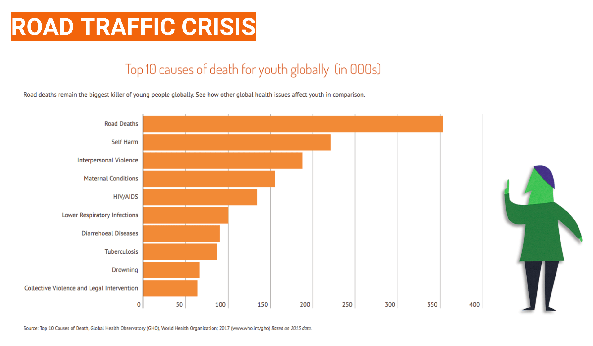 There are hundreds of reports out there that offer an insight into road safety, many of them 1000 pages long and scattered over different risk factors, regions and themes. For a young person wanting to learn about road safety, tackling all these reports would be a daunting task! That’s why we have done it for them. We condensed reams of information into easy, bitesized and youth-friendly chunks to make it easy for young people to grasp the global road safety crisis facing young people, why youth are at particular risk, the key risk factors and how they can get started.